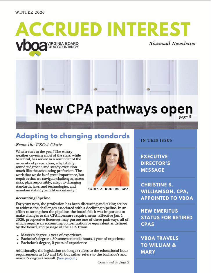 The VBOA produces a newsletter twice a year filled with news and updates relevant to the Virginia CPA and exam candidate community, along with disciplinary actions.
